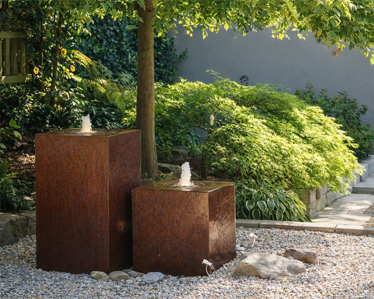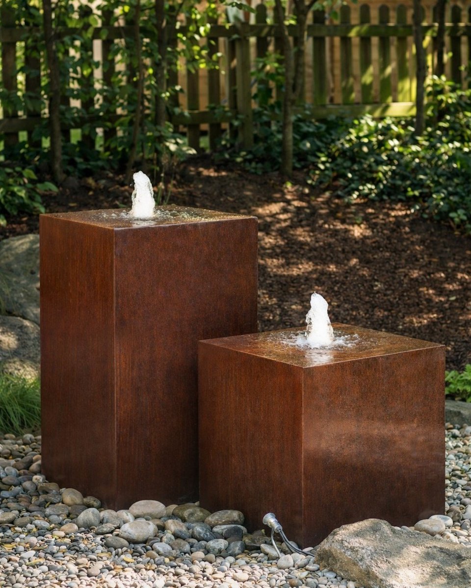 Cortenstahl Duo 60/100cm Würfel und Quader Edelrost Gartenbrunnen Komplettset