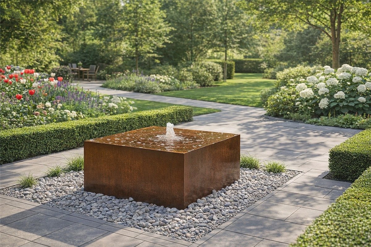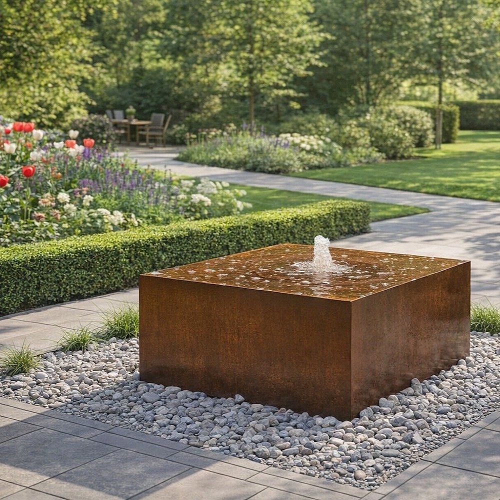 - Mit diesem Cortenstahlbrunnen Komplettset erhalten Sie einen Edelrost Quader mit Quellschale inkl. Einbaubecken, Abdeckung, Pumpensystem und Anschlussteile in hochwertiger Qualität sowie eine detaillierte Einbau-/Montageanleitung mit wertvollen praktischen Experten-Tipps