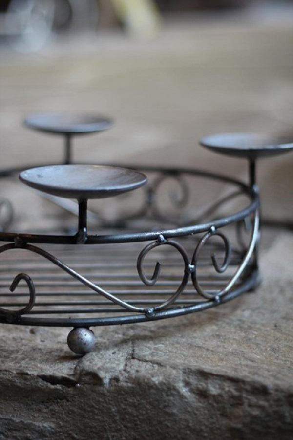 Die Kerzenteller aus Eisen haben einen Durchmesser von 9 cm und sind leicht gewölbt. Der Adventskranz hat 4 Eisenkugeln als Füßchen.