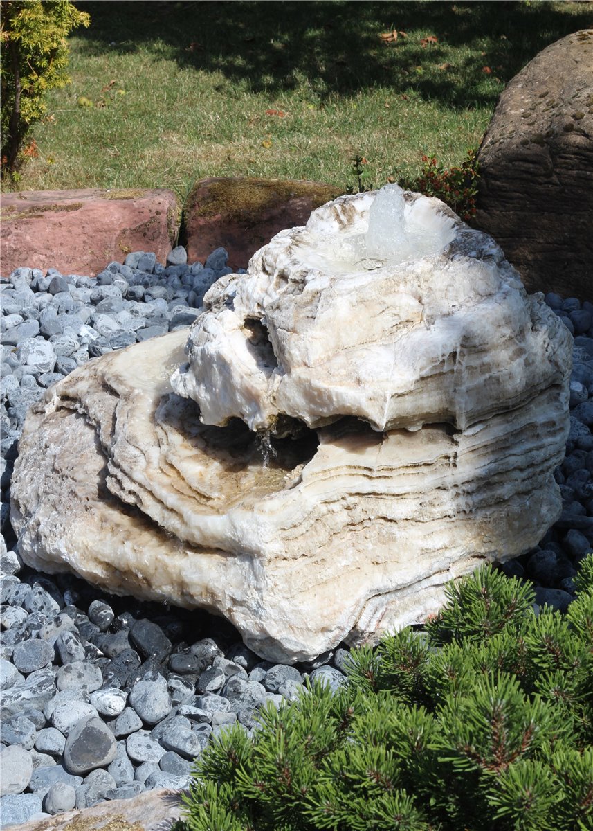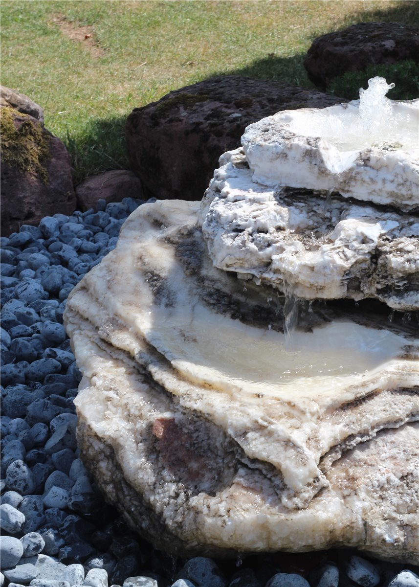 - Das Wasser entspringt oben aus der Quelle und läuft im Stil eines Bachlaufs die teils natürlichen, teils ausgearbeiteten Quellschalen herab. Die absolut einzigartige, natürliche Form und Struktur machen den Quellstein zu einem besonders tollen Highlight in jedem Garten